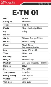 Xe đạp Trợ lực điện Thống Nhất E-TN 01 là dòng sản phẩm được phát triển nhằm đáp ứng nhu cầu di chuyển hiện đại: nhẹ nhàng hơn, tiết kiệm sức hơn nhưng vẫn giữ trọn trải nghiệm đạp xe truyền thống. Sự kết hợp hài hòa giữa cấu trúc xe đạp quen thuộc và hệ thống trợ lực điện thông minh giúp E-TN 01 trở thành giải pháp di chuyển hiệu quả cho người Việt trong môi trường đô thị đông đúc.