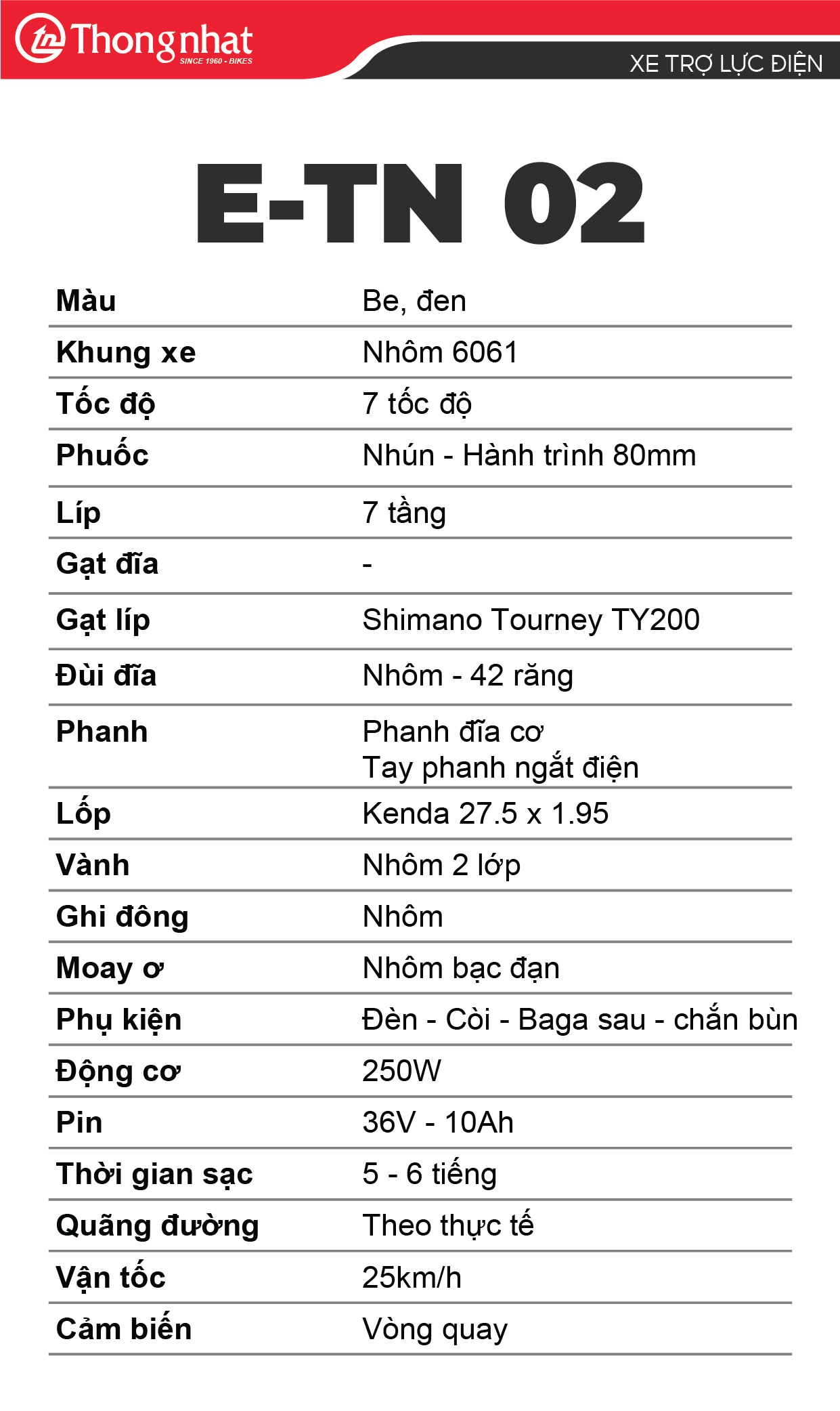Xe đạp Trợ lực điện Thống Nhất E-TN 02 là dòng sản phẩm được phát triển nhằm đáp ứng nhu cầu di chuyển hiện đại: nhẹ nhàng hơn, tiết kiệm sức hơn nhưng vẫn giữ trọn trải nghiệm đạp xe truyền thống. Sự kết hợp hài hòa giữa cấu trúc xe đạp quen thuộc và hệ thống trợ lực điện thông minh giúp E-TN 02 trở thành giải pháp di chuyển hiệu quả cho người Việt trong môi trường đô thị đông đúc.