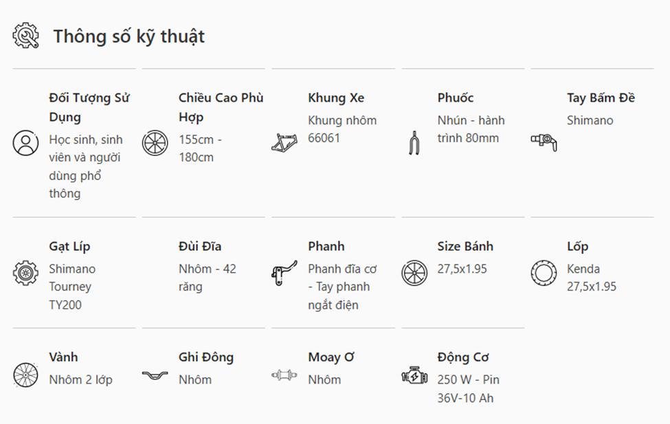- Sạc: 42V – 2A, thời gian sạc đầy 5–6 giờ